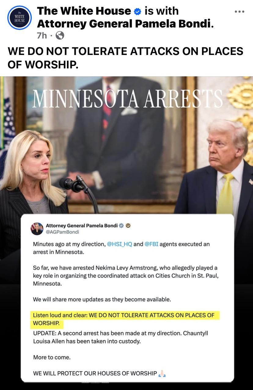 We applaud U.S. Attorney General Bondi for taking a strong stance to protect houses of worship and for holding those that jeopardized that this past weekend in Minnesota to account.